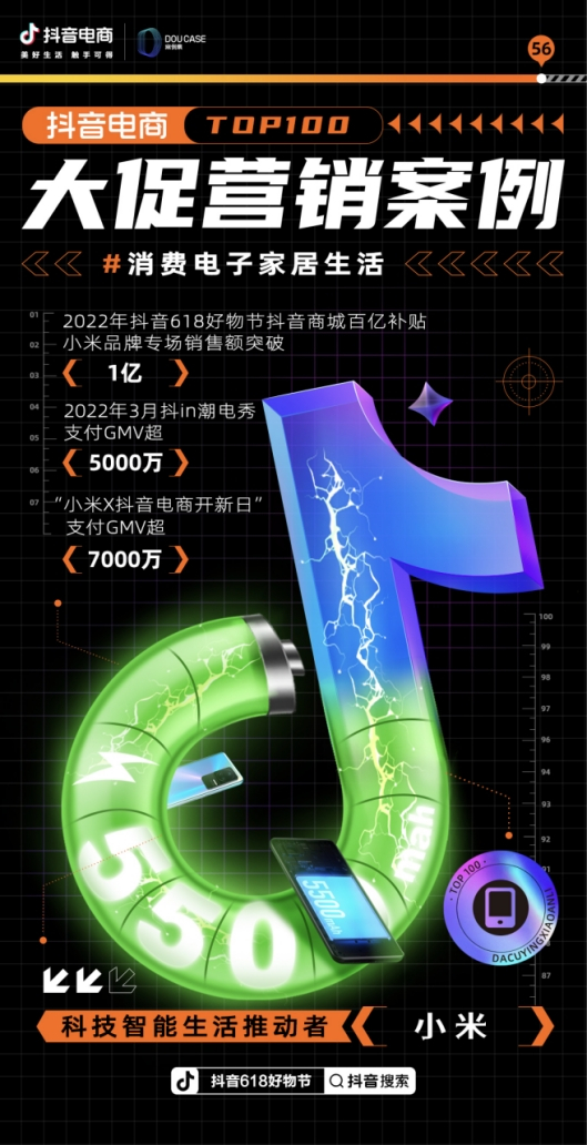 随着兴趣电商迈向全域,越来越多的商家、达人在抖音电商中寻找新的突破、抢占新势场,以“兴趣”实现自身的长效经营。 作为兴趣电商的见证者与参与者,他们在与抖音电商一同成长中取得的卓越成绩,也值得更多肯定。在今年618大促期间,抖音电商联动100+合作伙伴,通过以成绩展示为核心的创意海报、以年度平台级节点活动展示为亮点的“大促营销宝典”,推出了美妆、服装鞋包、消费电子家居生活等10个行业的优秀大促营销案例。其中,首个在抖音商城大促成交破亿的小米,泛商城环比成交实现翻番增⻓的宝洁,销售额破亿元的蕉下等品牌,更是成为“兴趣生意”创造多维价值的典型代表。