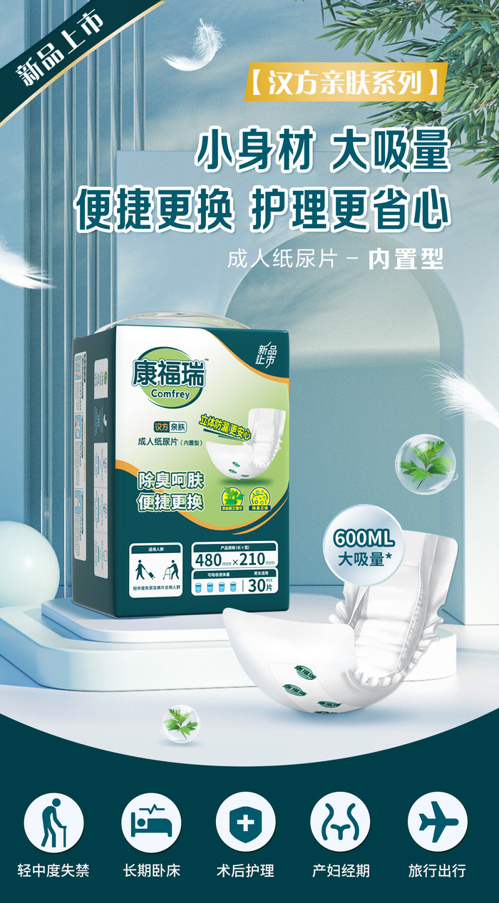 随着失禁人群对包括纸尿裤在内的泌尿、失禁等健康护理需求的不断细分和升级,康福瑞作为国内头部纸尿裤制造商豪悦护理旗下的成人纸尿裤品牌,以良好的产品品质、高性价比,深受中国消费者的青睐。成立多年以来,康福瑞始终严苛依据国家标准,臻选全球高端原材料,不断改进产品工艺,专为轻中重度失禁、行动不便、不能自理、产后创伤、术后调养及特殊工作环境下的不同需求消费者提供优质的纸尿裤、纸尿片和卫生垫等成人护理产品,致力于改善失禁患者和护理人员的日常生活品质。为了缓解护理者的护理负担,提升使用者的舒适度,康福瑞在吸收性能、亲肤防疹、除臭抑味方面做了贴心设计,推出了康福瑞汉方亲肤系列成人纸尿裤(日/夜用腰贴型纸尿裤以及裤型纸尿裤),突破常规失禁保护。近日,为满足多重护理需求,便捷更换,汉方亲肤系列成人纸尿裤家族再添新成员——康福瑞汉方亲肤系列成人纸尿片。