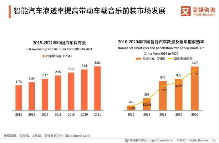 随着汽车产业的不断迭代,我国汽车保有量及智能汽车数量皆呈现稳步增长态势。据艾媒咨询出具的《2021-2022年中国车载音乐市场发展趋势研究报告》显示,2020年智能汽车数量突破千万量,2021年汽车保有量为3.02亿辆。智能汽车渗透率的提高直接带动了车载音乐前装市场的发展。在市场规模持续增长、发展日渐成熟的态势下,酷我音乐凭借早期布局、专业团队和技术研发,成为了车载音乐行业的头部平台。