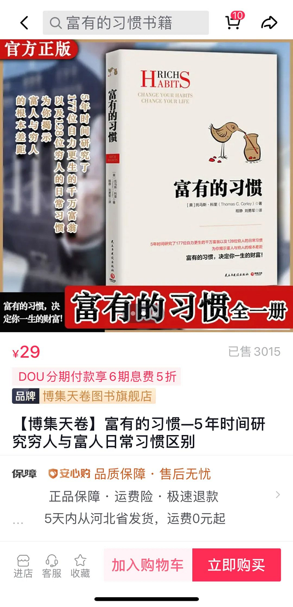 得益于抖音电商独特的“兴趣电商”属性与推荐机制,即使不是新产品,也有可能获得重新绽放生机的机会。例如博集于18年五月上市的《富有的习惯》,该书上市初期,销量并不惹眼。但2020年,达人自发拍摄剪辑了一条介绍该书的短视频,发布在抖音平台,瞬间让该书成为爆款,至今仍在不断加印,2020年销量远超之前数年销量之和,并将热度延续至今。