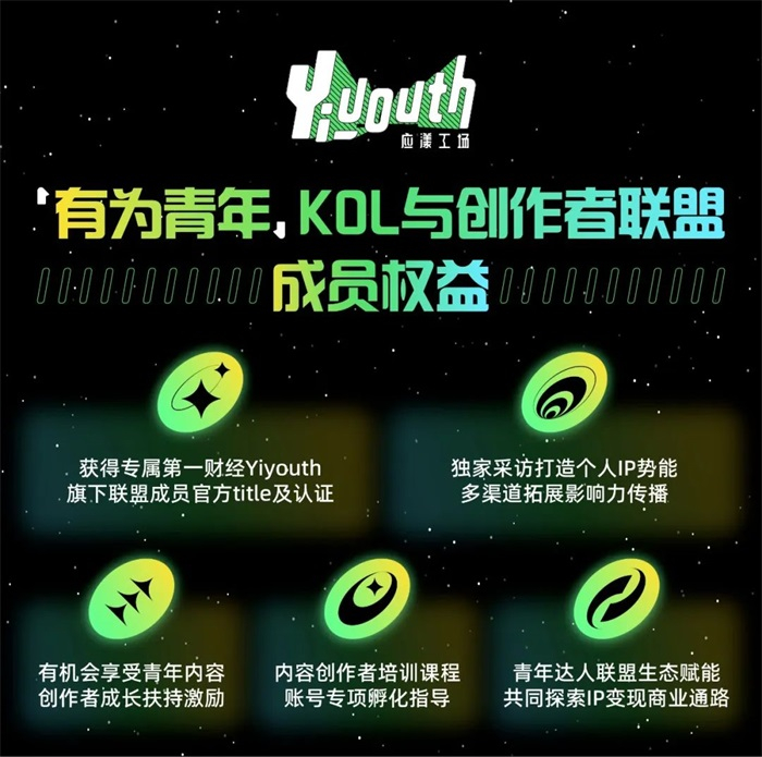 在「‘有为青年’KOL与创作者联盟」,Yiyouth将通过内容力、影响力、商业力,全方位赋能青年内容创作者的全面成长。