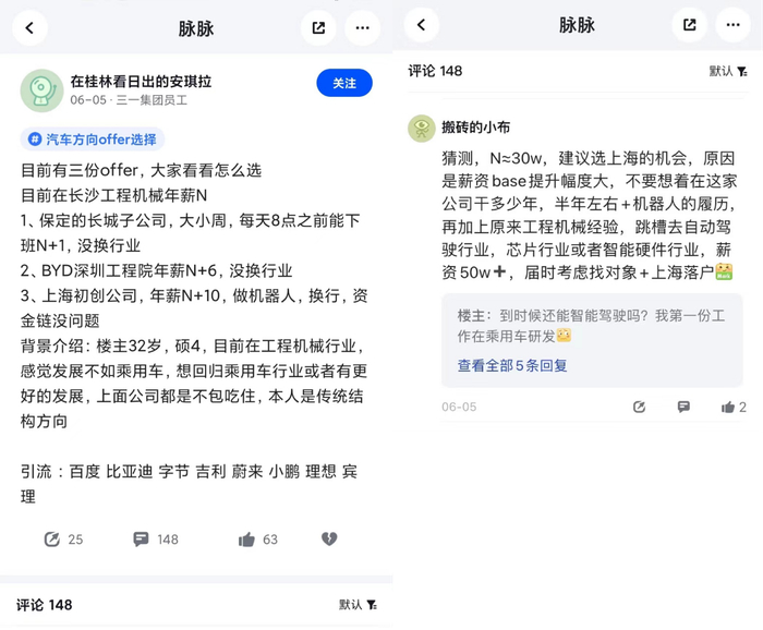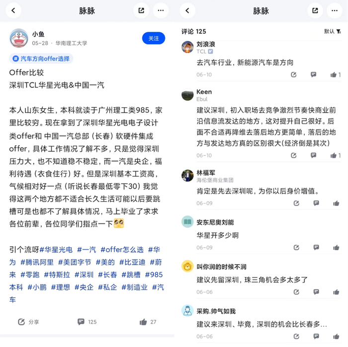 有人盘旋在汽车行业顶空,寻找落足点,也有人已然手握offer,在不同去向间谨慎抉择。今年毕业于华南理工大学的脉友小鱼在长春一汽和深圳华星之间踌躇不决,而针对小鱼的发展规划,有脉友提议信息流发达、发展机会多的深圳能为其提供更广的成长空间,而也有脉友着眼于一汽所处的新能源汽车行业,指出行业发展前景也是应届生需考量的要素。