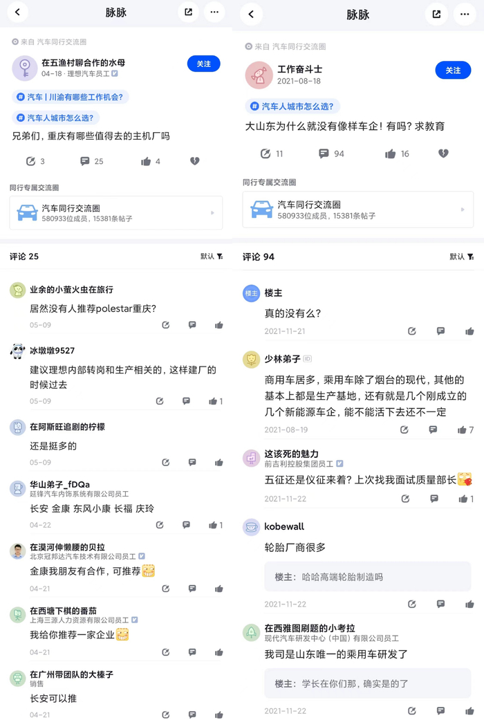 除长三角等成熟汽车产业区外,重庆这一汽车工业城也让不少汽车人心生向往。长安、东风小康、金康、Polestar等众多车企集聚山城,多样的机遇也向职场人敞开;而作为北方一大省,汽车研发荒漠的山东则让怀抱梦想的汽车人期待落空。