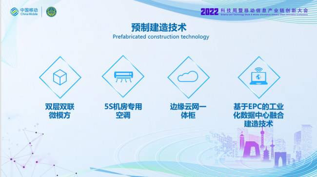 预制建造技术 。采用全栈建设理念,自主研发多款数据中心智能硬件产品,结合“基于EPC的工业化数据中心融合建造技术”攻克了传统数据中心建设周期长,需求匹配差,节能效率低的难题。“双层双联微模方”是100%自主研发的数据中心智能硬件产品,获得7项发明专利和3项实新专利授权,具有“多快好省,即装即用”的优势,入选《国家通信业节能技术产品推荐目录(2021)》、获得中国移动第十九届科技进步与业务服务创新奖-产品开发奖金奖。“5S机房专用空调”针对机房局部热点问题开发,具有更节省(Save)、更静音(Silent)、更小巧(Small)、更可靠(Safe)、更智能(Smart)特点,与现有精密空调相比,占地面积可节约40%左右,室外机噪声降低5~8dB,PUE最低可达1.25,获得1项发明专利和3项实新专利授权。“边缘云网一体柜”是100%自主研发的边缘数据中心智能硬件产品,产品入选中国移动核心能力及自主产品清单,中国移动百大科技成果;“融合建造技术”,打造方案标准化、产品预制化、交付总成化、管理平台化、运维智能化五大能力,获得中国工程建设标准化协会2021年数据中心科技奖三等奖,并写入《数据中心基础设施建设项目工程总承包管理标准》团标。