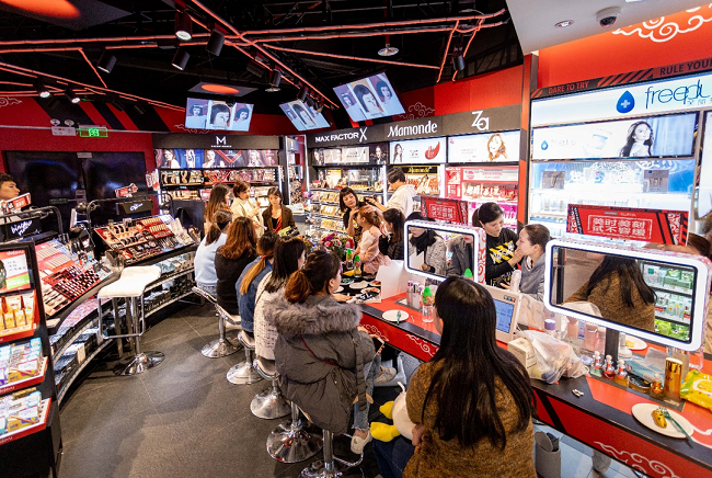 线下,屈臣氏用更潮流的元素进行了一系列装饰改造,还借助数字技术,升级了门店服务方式,在店内增加了扫码购、皮肤测试、虚拟试妆等。
