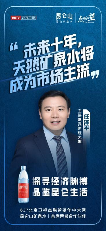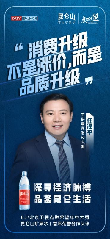 6月17日北京卫视“点燃希望:寻找中国经济新机遇”宏观经济年中秀上,主讲嘉宾任泽平深度解读未来新消费趋势,称饮水升级是中国消费升级的重要表现,并表示看好昆仑山矿泉水为代表的高品质矿泉水成为未来居民饮水消费的主流。