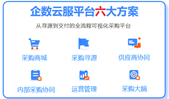 提供采购管理平台-企数采,其中包括6大解决方案:采购商城、采购寻源、供应商协同、内部采购协同、运营管理和采购大脑;