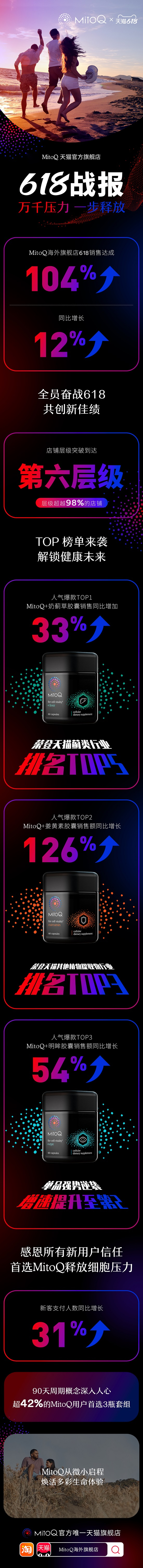 今年是MitoQ连续参加天猫618购物节的第三年,也是MitoQ在国内市场发展的第五年。随着大众对健康的日益关注与追求,MitoQ凭借核心专利成分MitoQ分子,收获了消费者与行业的一致好评认可,并在细胞健康赛道稳健发展。MitoQ自开设天猫官方旗舰店,就成功实现销量及市场占比份额连年增长。