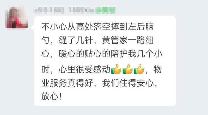 6月9日,星河山海半岛二期的管家仙人掌(黄善德)接到一位业主的求助电话,因取电视柜上方物品不小心踩空摔破了头,整个人眩晕不已。挂了电话后,管家迅速跑到现场,急忙开车带着业主赶往吉隆第二人民医院,就医期间,管家全程陪伴,寸步不离地细心照料,令业主十分感动地发文到业主群,表扬管家的暖心相助。
