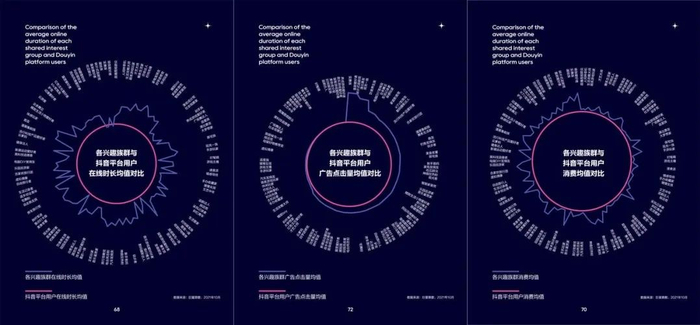 紧接着,巨量算数又以兴趣、画像、活跃度和消费力的相似度进行族群化聚合,最终生成了103个兴趣族群;并且在此基础上,对兴趣族群在兴趣、生活理念、价值观等特征近似的族群进行圈层化聚合,21个兴趣圈层也逐渐清晰。