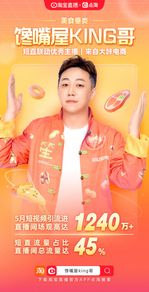 在淘宝直播的美食品类带货3年多的馋嘴屋King哥,去年第一时间入驻了点淘,他看到了点淘短直联动在种草方面的优势。通过短视频king哥向用户传达产品卖点的同时,也对直播的产品讲究作了补充,短视频又可以全时段种草。数据显示,今年5月,king哥获得的短视频导流高达1240万,占直播间总流量的45%,这是一个惊人的比例。