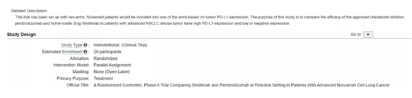 它是一项开放标签、随机、II期临床试验。如上文所说,它的目的在于比较信迪利单抗与帕博利珠单抗(K药)在一线治疗晚期非小细胞肺癌时单药或联合化疗的疗效。