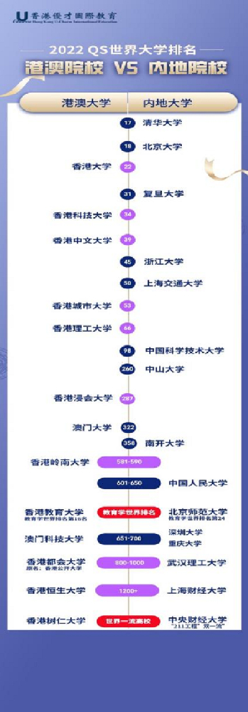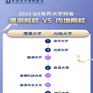 2022QS世界大学排名中,香港大学高居世界第22位,香港第1位。香港科技大学位列全球第34位,香港中文大学位列全球第39位。香港城市大学、香港理工大学也进入世界前100,排名远超内地学子所熟知的南京大学、武汉大学。