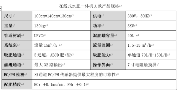 水肥一体机的工作原理是通过营养液混合箱的特殊结构将供水泵供入的水与吸肥系统吸上来的肥进行充分混合,将混合后的营养液通过储液罐、灌溉管道和滴箭、滴灌等设备施给植物。根据不同作物不同生长期需水需肥规律和土壤传感器监测的土壤情况来控制水溶肥和酸的吸入量,由电导率和酸碱度传感器反馈实际电导率和酸碱度到控制单元,实现精准调配营养液,提高水肥耦合效应和水肥利用效率,达到节水节肥高产增效的目的。