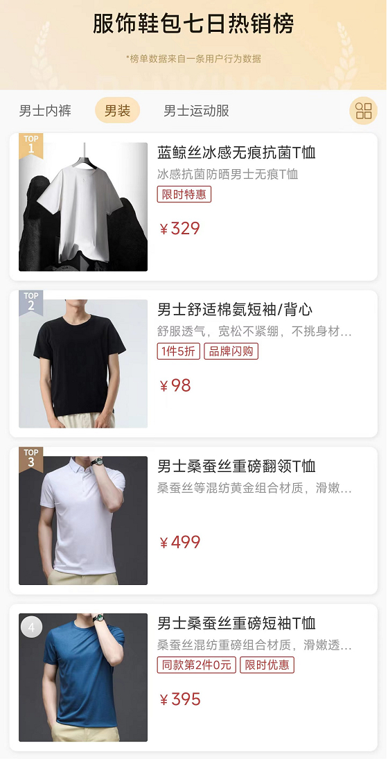 酷暑将至,男士对于贴身衣物的消费诉求便可通过榜单解读一二。榜首产品TAGX水母纱内裤、蓝鲸丝T恤皆为TAGX独家仿生科技面料,主打清凉透气、深海冰感、细腻柔滑的极致体感,吸湿排汗、抑菌速干的功能性特点更是抵御炎夏的必备武器。相较女性,男士更为重视产品实用性和品质,且一旦认可将持续复购,因此能够以优质的产品力直击男性用户痛点的品牌势必会受到男士拥趸。