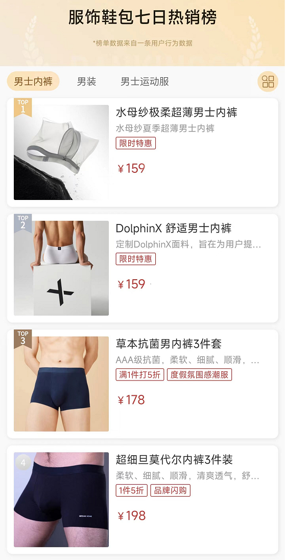 据一条生活馆最新周热销榜显示,男士贴肤科技品牌TAGX脱颖而出,名下新品水母纱内裤、蓝鲸丝T恤分别跻身男士内衣、服饰榜单No.1。