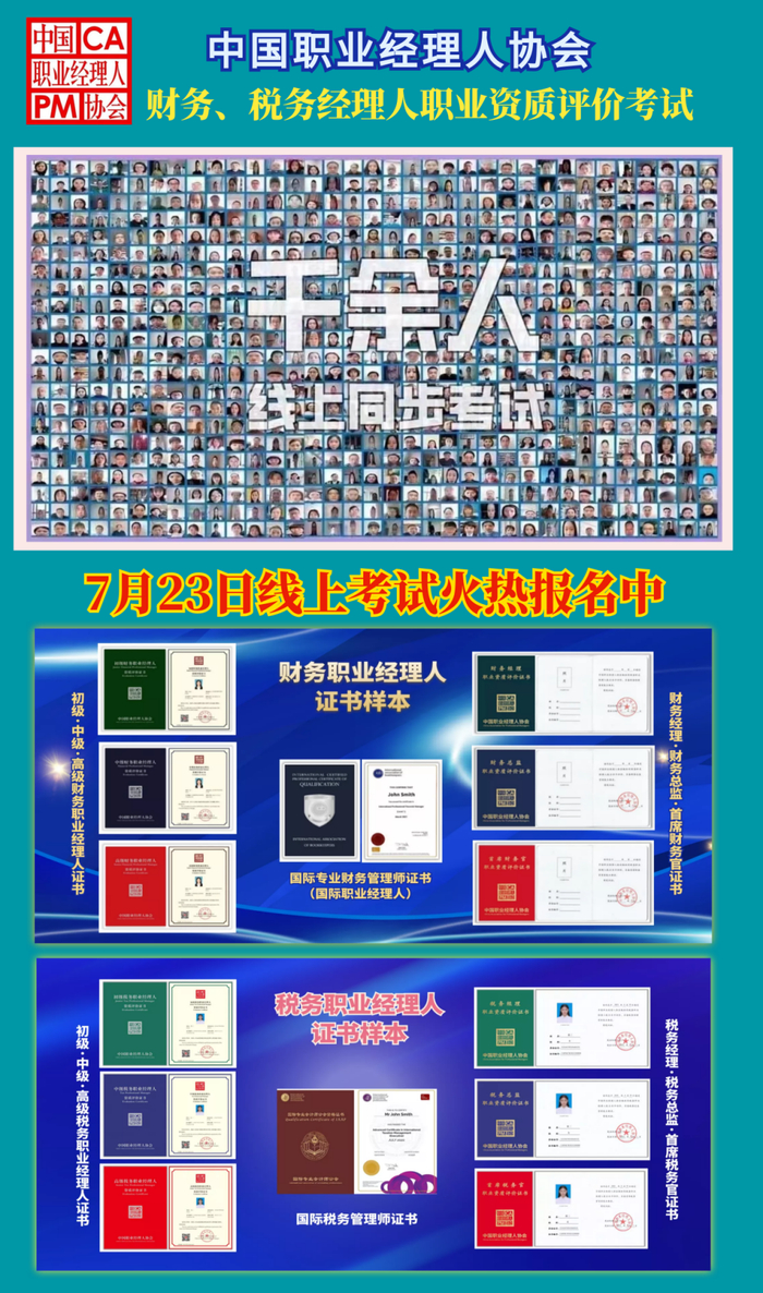 “财务经理人职业资质评价”划分为高级(首席)、中级(总监)、初级(经理)三个层级进行培训与评价,是岗位能力、职业能力和专业能力的全方位评价证书,评价方式采用国际国内双认证,通过评价考试的学员由中国职业经理人协会颁发初级、中级、高级三个等级的税务职业经理人证书,并根据国资委《关于中央企业加快建设世界一流财务管理体系的指导意见》中提出的加快建设世界一流财务管理体系的目标,由国际簿记师协会IAB为通过财务经理人职业资质评价考试的学员颁发国际专业财务管理师证书,增强财务人才队伍的国际竞争力和话语权。