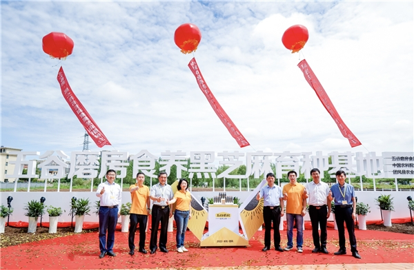 6月20日,五谷磨房食品集团联合中国农科院油料所、湖北省团风县人民政府于湖北省团风县成功举办五谷磨房黑金计划启动仪式暨食养黑芝麻育种基地揭牌仪式,并进行了食养黑芝麻新品系“黑之养1号”的播种。五谷磨房食品集团董事长桂常青、湖北省团风县县长胡凯、湖北省团风县副县长彭哲、中国农科院油料所芝麻与特色油料遗传育种团队首席王林海研究员、中国农科院油料所油料品质化学与加工利用团队执行首席邓乾春研究员等出席仪式。