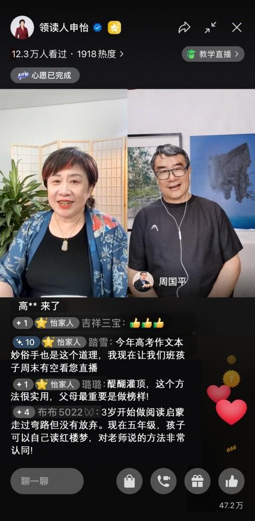 回到活动,周国平老师和申怡老师分别作为文学创作者和经典导读者的成功联袂,就无疑以互联网方式打造了新时代下精品文学向大众化推广的新样板,具有深远的人文价值和社会价值。一方面,通过直播连麦这样喜闻乐见的互联网玩法,不仅可以高效推广普及更多、更好的文学作品,也可以大范围深入传播更科学、高效的读书理念。更重要的是,在一个充满焦虑和焦躁的社会氛围下,以知识直播“授人以渔”,不仅可以让孩子了解、感受传统文化的魅力,沐浴中华文化的辉光,提升文学能力和人文素养,也能帮助家长通过读书释放工作压力、获取内心平静、得到精神安定,并从中汲取人生智慧,塑造积极向上充满正能量的三观。同时,在社会层面,更有助于让阅读真正成为一种全民习惯和风气,持续助力提升国民文化素养,促进社会和谐。