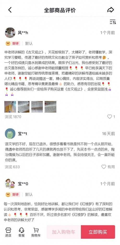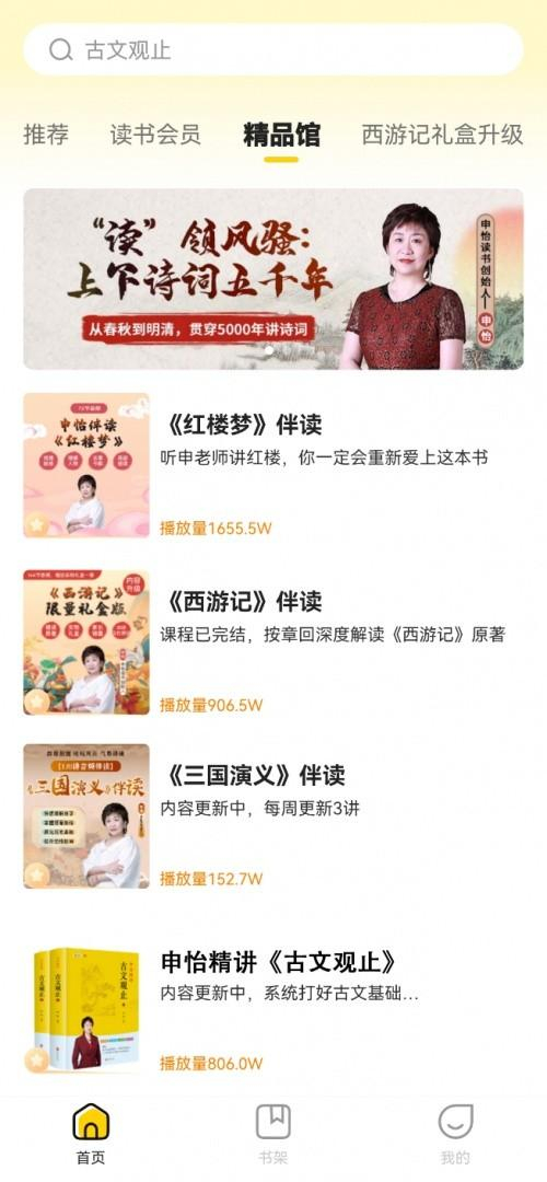 例如,《古文观止》汇编了从东周到明末之间的散文精品,多角度展现了中华文化的博大精深和先民非凡的文学成就,由此被众多语文教材乃至高考语文题目高频收录和引用。但其纵贯三千年,涉及政治、哲学、宗教等方方面面,对孩子来说难以读懂。对此,申怡老师的一门《古文观止》课程精选了书中的102篇传世经典,通过五大讲读结构,逐字逐句翻译讲解,在帮助孩子提升文言文阅读理解能力的同时提高文化底蕴。课程播放量超过780万次。而对于《红楼梦》这本“中国小说史上不可逾越的巅峰”、小初高必读经典书目,申怡老师组织团队精心打造了适合孩子听的红楼入门课——《申怡伴读红楼梦》,从青少年视角出发,帮助孩子梳理小说脉络、理顺人物,通过“古事今解”、局部细读,让孩子轻松读懂。课程播放量超过1600万次。最近,针对另一部传世经典《世说新语》,申怡老师也在每天的直播课带着粉丝进行晨读,同样受到广泛好评。