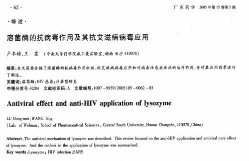 许多研究资料表明溶菌酶可能具有抗HIV感 染的作用。1983年,Prakash等报道州在包皮下湿处发现含有溶菌酶;Laumann等,对美国77例 包皮环切术的成年男子进行研究,结果表明:这些包 环切术的男子没有包皮下湿处,也没有溶菌酶保护,所以很容易被细菌和病毒感染。世界卫生组织资料也表明:和美国相比,其它发达国家做包皮 环切术的人少,所以美国受到HIV感染的机会就比 其它国家多出4倍,甚至更多。Chao报道做过 包皮环切术的丈夫对于怀孕妇女来说,是HIV感染的危险因素。Grosskurth等发现,在坦桑尼亚包皮环切术男子更容易感染HIV。日本东北大学的清 水文雄教授采集了 2至40岁的22名健康人唾液样品,各与0.5毫升含艾滋病病毒的唾液混合,在 37Y保温1 h,结果发现其中17件样品有99%的艾滋病病毒已被破坏,进一步研究发现这是唾液溶菌 酶起的作用。研究结果表明溶菌酶具有有效的抗 HIV感染的效果。
