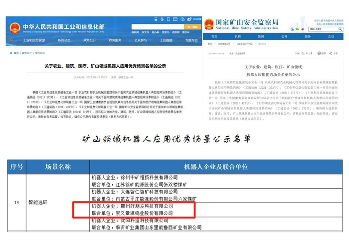 近日,由工业和信息化部装备工业一司以及国家矿山安全监察局综合司联合发布了《矿山领域机器人应用优秀场景名单》,赣州好朋友科技有限公司与崇义章源钨业股份有限公司旗下矿山联合打造的智能分选机器人应用项目,从全国129处备选的优秀矿山项目中脱颖而出,成功入选。