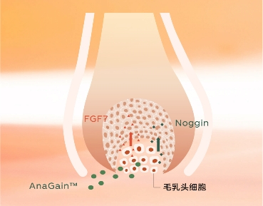 为从根源解决脱发问题,Vida Glow深入研究了头发的生长周期,在配方中添加具备强效活性的明星成分AnaGain™,它选用来自瑞士的有机豌豆苗萃取物,可以深入头发毛囊最基底部分的毛乳头细胞,通过刺激FGF7(一种促进头发生长期的细胞)和Noggin头蛋白(一种缩短头发休止期、减少掉发的细胞)两大生长因子,全面调节头发生发周期,让脱发不断减少,同时新发重新生长,秀发再现浓密。