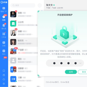 “消息密码锁,顾名思义,就是给重要消息加上‘密码’。”360织语的产品经理表示,这种密码锁保护可以有效防止在私密环境下的敏感信息被泄露,“用了消息密码锁加固之后,对于被锁的工作信息,接收方需要解锁后才能查看,杜绝了被他人盗取或者不小心看到而产生的泄密风险。”