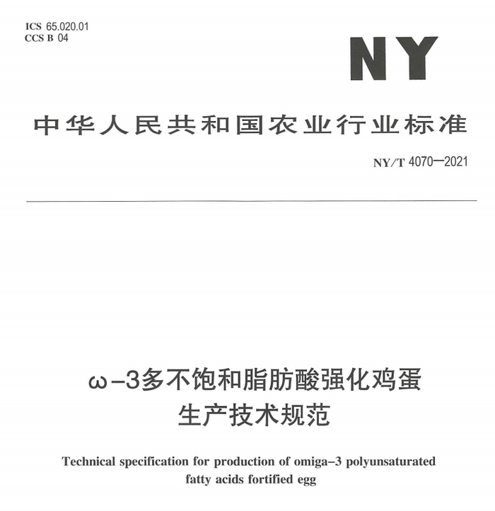 2022年6月1日,我国农业农村部公告(第504号),《ω-3多不饱和脂肪酸强化鸡蛋》(NY/T 4069-2021)、《ω-3多不饱和脂肪酸强化鸡蛋生产技术规范》(NY/T 4070-2021)两项标准,正式实施。