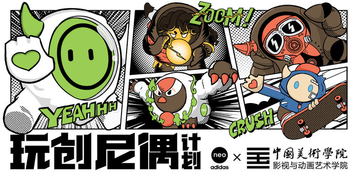 Z世代青年喜欢个性鲜明的玩闹表达,他们时髦前卫追崇“有趣至上“,又敢想敢做拥有超燃的创作热情。为鼓励年轻人自由施展天马行空的创意,深耕本土文化,2021年底,集结Z世代各路玩家的adidas neo开启品牌故事“玩创尼偶计划”,与多位本土年轻玩创家“脑洞对接”,创造五款萌系玩偶。今年恰逢中国动画100周年,adidas neo又开始“搞事”了!“玩创尼偶计划”2.0版本升级再来,adidas neo联动中国美术学院影视与动画艺术学院,挖掘本土青年动画人无限创意打造了4支极具玩创精神动画片。青年动画人们以adidas neo的IP形象“阿迪达斯尼偶”为设计灵感,并融合本土文化和品牌玩乐精神,自由大开脑洞表达创意。
