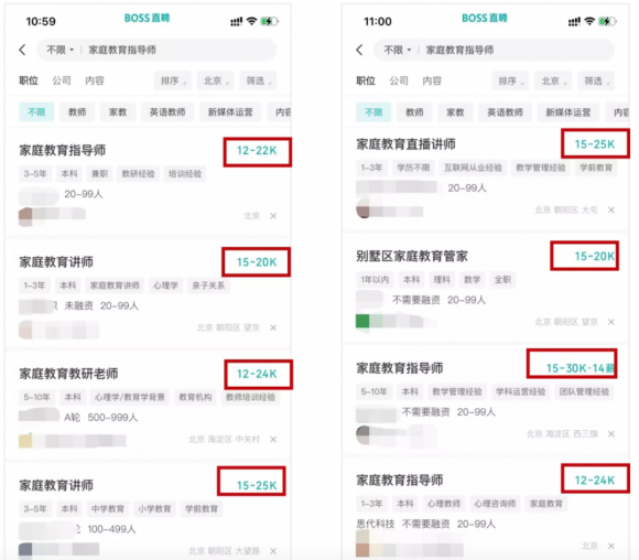 人社部将会同有关部门组织制定新职业标准,指导培训机构依据国家职业标准开展培训。同时,积极稳妥推行社会化评价,对评价认定合格的人员,由评价机构按照有关规定颁发证书,获证人员可按规定享受职业培训补贴、职业技能鉴定补贴等政策。随着《家庭教育促进法》的出台实施和“双减”等政策的推行,“家庭教育指导师”这一职业持续升温。在某招聘网站上定位北上广深,搜索“家庭教育指导师”,可以看到该岗位年薪普遍在15-30万元之间,最高年薪为50万。