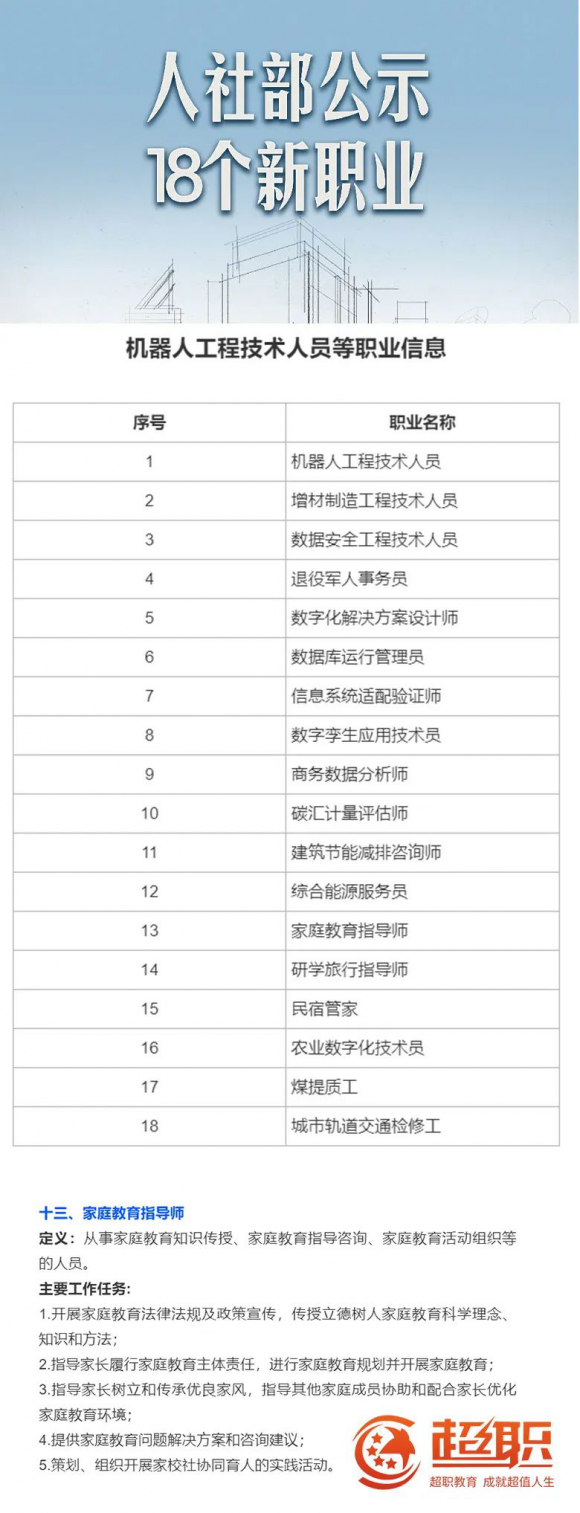 下一步,新职业信息经公示征求意见、修改完善后,将被正式纳入新版《中华人民共和国职业分类大典》。关注公众号【超职在线】报名