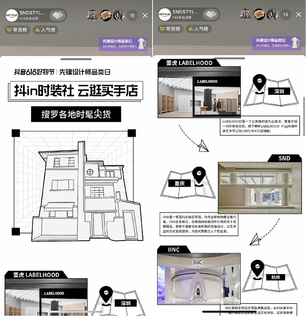 在先锋设计师品类日中,抖音电商服饰行业发起“抖in时装社 云逛买手店”活动,蕾虎(上海)、SND(重庆)、IINC(杭州)等一线买手店携MARCHEN、SHUSHUTONG、GANNI、IMMI等顶尖设计师通过自播实现销量集中爆发,其中买手店服饰全周期销量破千万,平均客单价破千元,为时尚消费人群提供了优质的即看即买互动购物体验。