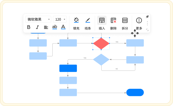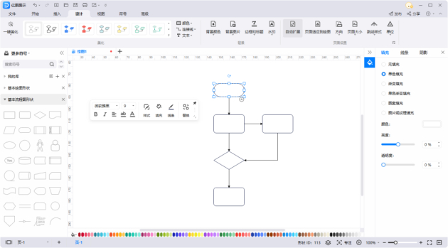 本次升级,亿图图示特别提升了用户的交互体验与效率。不仅针对菜单架构、工具栏等进行了优化,更是新增了浮动工具栏。当用户选中符号时,系统就会在符号周围唤起浮动工具栏,支持字体加粗、图形填充、符号对齐等快捷操作,还可以将其拖动到任何空白位置,或者点击右下角的“收起”按钮收起浮动工具栏。