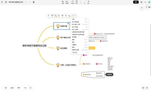 除以上几点外,亿图脑图协同版同样是以浮动工具栏替代右侧面板进行操作,极大提高了协同效率。用户选中主题时,系统就会在符号周围唤起浮动工具栏,支持添加子主题、同级主题、变更线条颜色、线框颜色、主题形状等快捷操作。