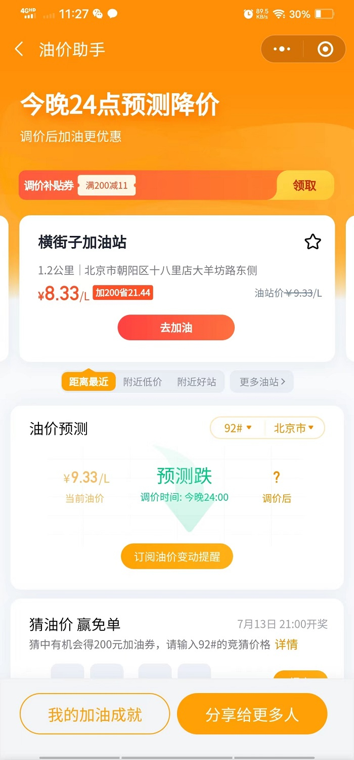 在“优惠加油”内还提供了车主加油相关的贴心服务。例如在“我的优惠加油”功能中,可以查看加油月账单、省油排名等,还可设置常用加油站。“油价助手”具有预测功能,可时刻为用户提示油价信息、价格预测, 帮助用户选择更省钱的时间节点来加油;“摇免单”可通过面对面摇一摇,赢取加油免单的机会。