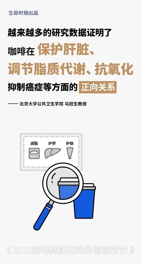 根据人民日报健康客户端、马冠生/马博士健康团联合出品的《2021咖啡健康化趋势洞察报告》,越来越多的研究数据证明了咖啡在保护肝脏、调节脂质代谢、抗氧化、抑制癌症等方面的正向关系。这些无疑精准击中年轻人的需求,让咖啡成为健康生活中的新宠儿。