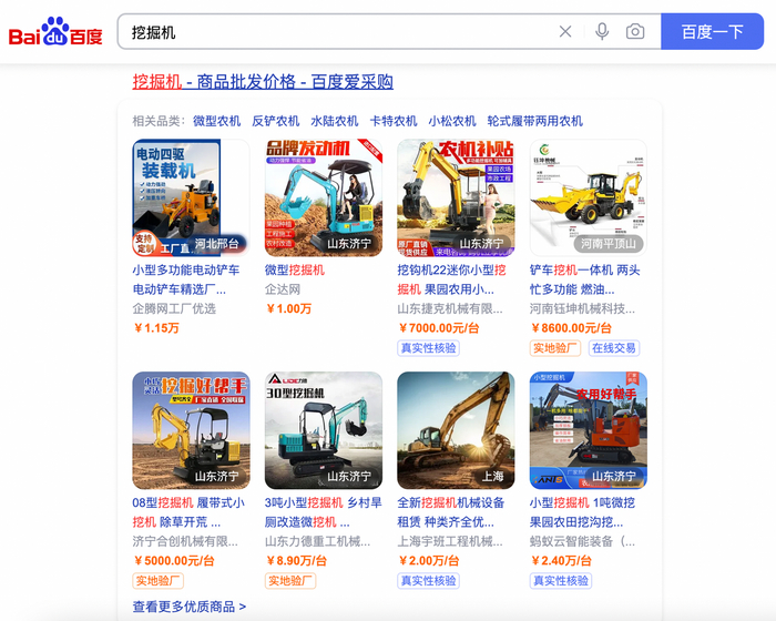 每一次采购,从搜索开始。爱采购能够为工厂带来的成功,得益于它与百度搜索的深度绑定。记者发现,在百度上搜索“挖掘机”,不需要投额外的搜索广告就能在首页展现公司产品。