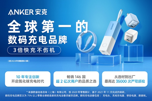 ”Anker安克,作为高品质智能充电专家一直在潜心解决充电技术的核心关键问题,给广大消费者带来更安全、更高效及更创新个性的新一代极致充电体验。十一年发展,Anker安克走遍全球146个国家,获得2亿次用户的信任。