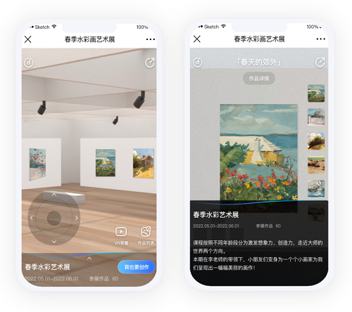 例如,小麦助教美育版结合3D技术为机构搭建起「3D艺术展」,低成本打造高质量的展览。VR技术打造沉浸式展览空间,通过3D空间切换查看任意作品信息,家长足不出户也能身临其境,“云逛展”带来极佳体验感。