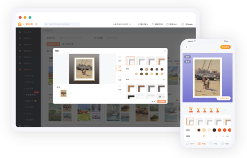 对此,小麦助教美育版设计开发的「作品裱框」模块通过一键套用内置「外框」、「内框」、「背景」等大量装裱素材,轻松切换多种美化工具,快速完成学员日常作品的装裱工作,提升作品质感和美观度的同时,提高了机构的工作效率。