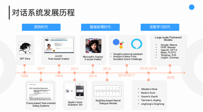 起源于图灵测试的AI对话系统,是人工智能领域最重要的研究方向之一。如果说自然语言处理是人工智能“皇冠上的明珠”,那么AI对话系统则是自然语言处理中最难、最核心的任务之一,是“明珠中最亮的那颗”。因此,AI对话系统被认为是衡量人工智能发展水平的重要因素,代表了人工智能的发展方向。在工业应用领域,AI对话系统呈现出“爆炸式”增长的态势,如以“小度”“小爱”为代表的智能助理,广泛应用于个人助理、智能家居、智能汽车中,还有以谷歌对话机器人Meena、Facebook聊天机器人Blender为代表的开放域闲聊产品中,与大众日常生活紧密相关。