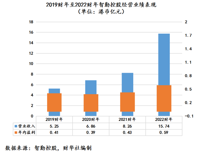 2022财年,智勤控股实现营收为15.74亿港元,同比增长90.6%,年内溢利0.59亿港元,同比增长39.1%;扣非归属股东净利润为0.39亿港元,同比增长6%。其中,营收、年内溢利、扣非归属股东净利润均再次刷新公司上市后历史新高。