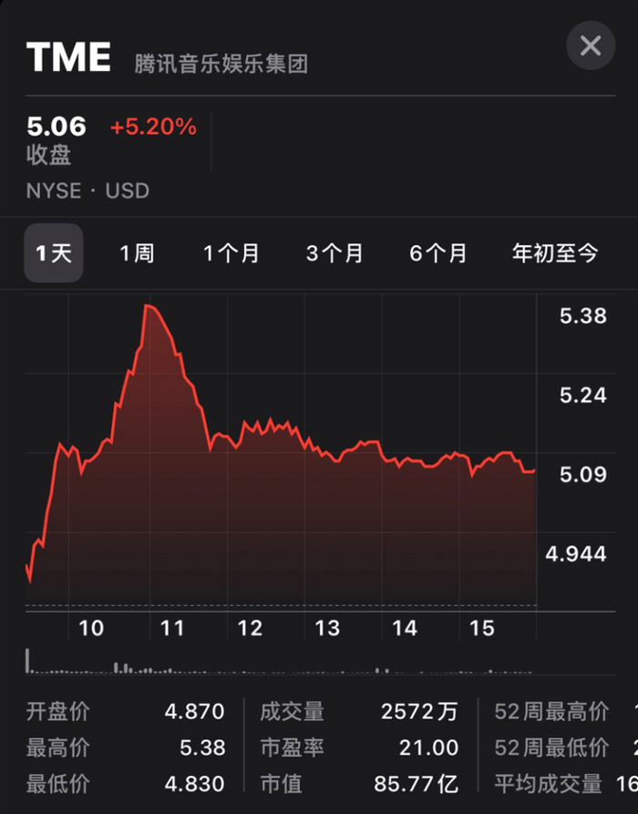 腾讯音乐股价涨5.20%,近期获多家国际投资机构增持