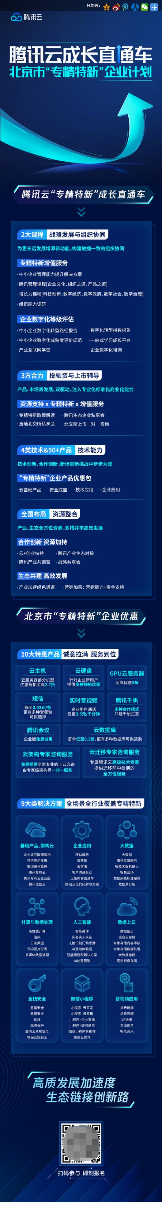 “中小企业是北京市推进技术和产业创新、实现经济高质量发展的重要基础。”腾讯云华北区副总经理田丰表示,为此,腾讯云立足新基建、技术、连接、生态等四大优势,全力做好“专精特新”数字化助手,为北京中小企业专门推出一揽子成长助力工具和解决方案。