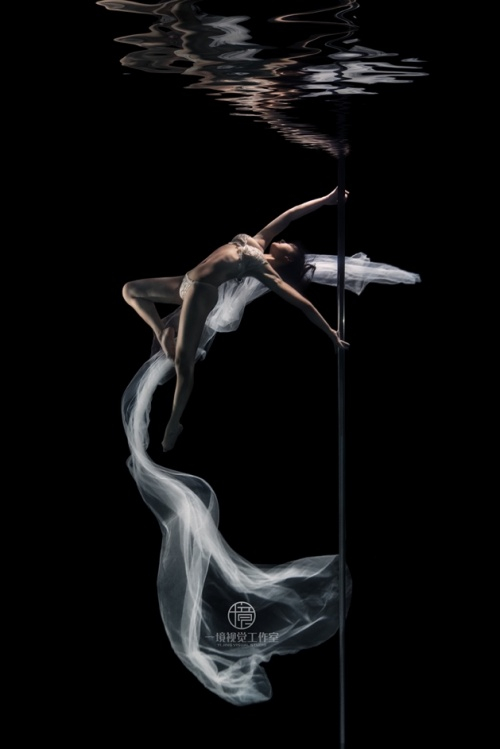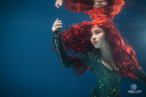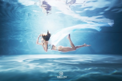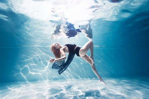 和海洋水下摄影记录性的拍摄技巧不同,水下商业摄影往往在人造水池中,虽然没有自然光照但却更注重光影的重塑,可在水中布光及组建成熟的拍摄团队,这是一个非常巨大的挑战。在水下进行商业拍摄的时候,大部分模特一开始都会感到紧张,他们需要不戴面镜憋气下水,睁裸眼作出合适的表情。为了更好的拍摄水下模特,刘子旭也和模特一样采用自由潜水的闭气方式,将自己的静态闭气时长延长到近5分钟,这样可以让被拍摄对象更加容易放松且快速进入状态。