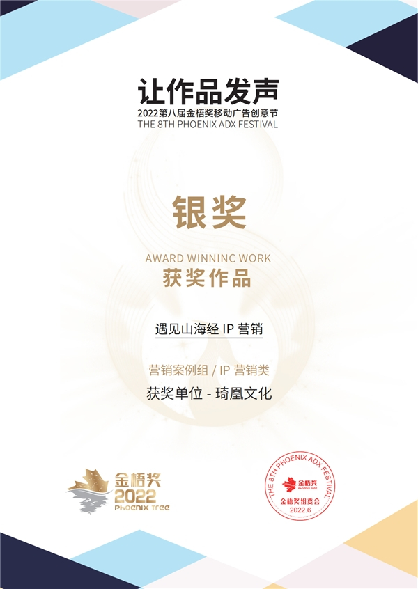 近日,秉承“让作品发声”为核心并着力推动移动互联网数字化商业的专业奖项——2022年第八届金梧奖落下帷幕。第八届金梧奖共收到来自品牌方、广告代理商、技术公司、媒体平台等280家参赛公司,提报的1123件作品,其中130件非案例作品,经过120位评委,为期9天的线上初审,共有490个案例入围终审评选。遇见馆藏旗下知名原创文化IP“遇见山海经”,荣获本次金梧奖IP营销类银奖。