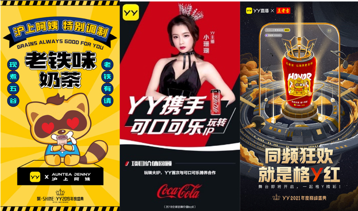 不同于其他品牌在跨界合作中联合海报发布、广告位置换等常规硬曝光方式,YY直播在跨界合作方面,也充分发挥了内容平台在创意和定制方面的特长。本次“颜出即行”活动,YY直播打包牙牙、小阿七、海涛等美食+音乐+户外领域的主播,结合主播个人标签定制直播内容,并充分结合线下出行场景,最大化的发挥了跨界合作的效能。此前,YY直播曾联手沪上阿姨推出老铁味奶茶,“直播配奶茶,还是老铁味”的口号助力沪上阿姨这一新晋潮牌走进YY直播粉丝中。此外在去年的年度盛典,YY直播也在与王老吉的跨界合作中,打造了独特的“格Y”红联名定制罐,引发粉丝争抢热潮。
