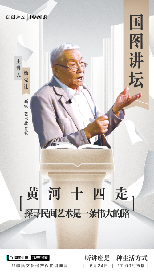 “过去民间艺术人死艺亡的现象太严重了,得快些抢救”。近日,在国家图书馆官方抖音账号@方寸大观 国图视听“国图讲坛”栏目最新一期的讲座直播中,著名画家杨先让掷地有声地说。在这期主题为《黄河十四走——探寻民间艺术是一条伟大的路》的公开讲座中,杨先让分享了自己和民间艺术结缘的历史,以及先后14次去黄河流域考察民间艺术,不遗余力传播中国传统艺术瑰宝的故事。直播吸引了超110万人次在线观看。