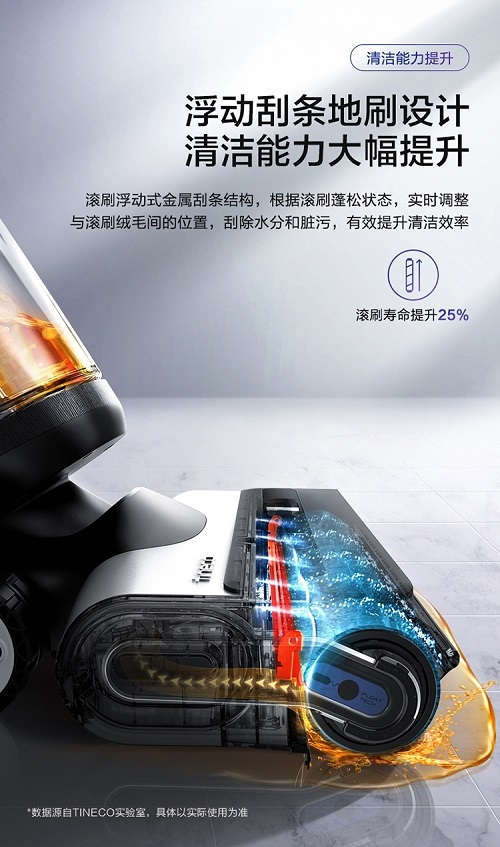 在自动识污方面,芙万3.0能自动识别脏污类别和程度,并智能调节清洁力度,不仅更省水省电,还能提高清洁效率,减少重复拖洗次数。内置浮动刮条设计,也能智能识别滚刷蓬松状态,从而实时调整与滚刷绒毛间的距离,刮除水分和脏污,在提升清洁效率的同时也能将滚刷寿命提升25%。